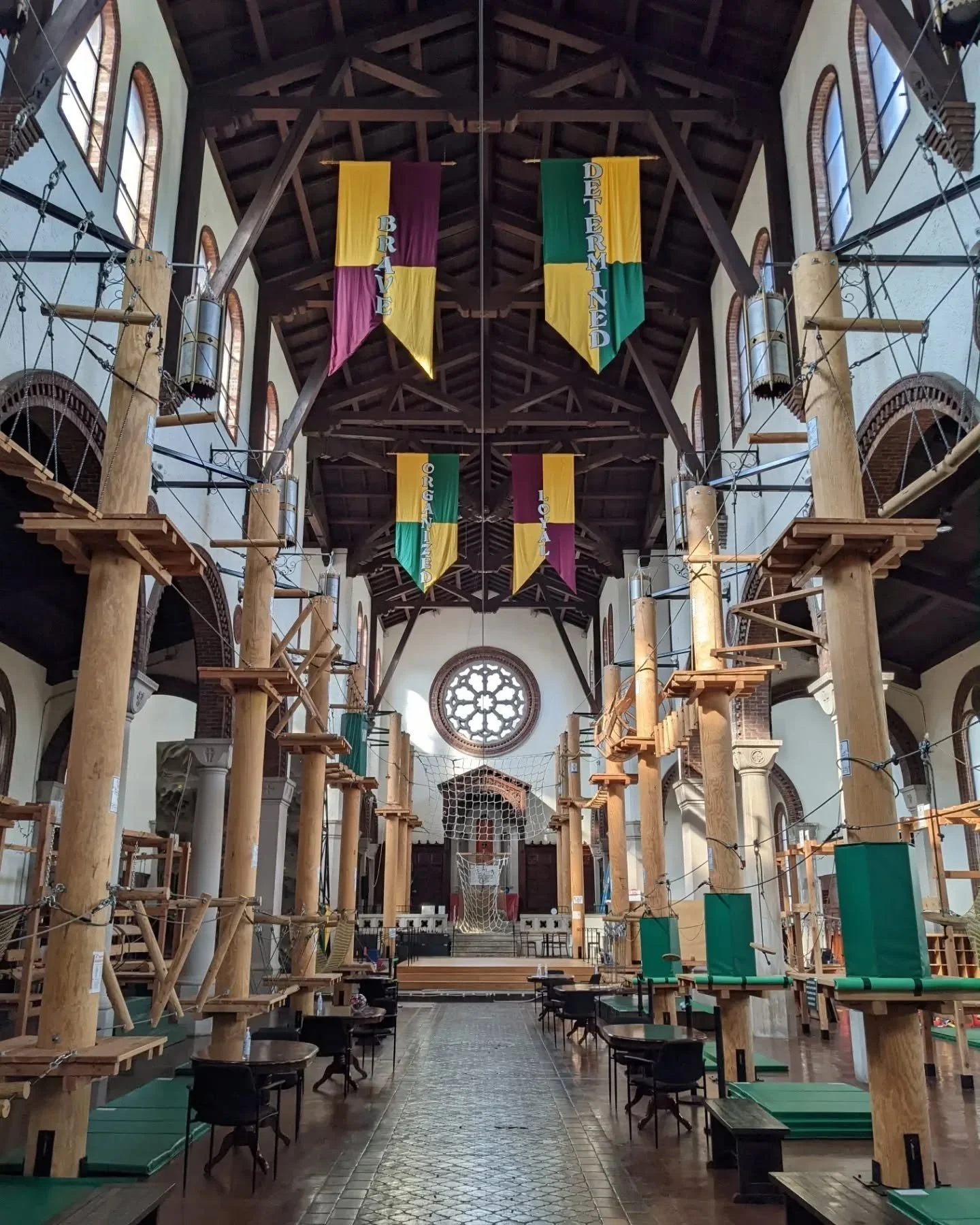 View fullsize Dragon's Den is a ropes course, climbing gym, and at its core a community center set in the old St. Mary Magdalene Church in Homestead. It's a beautiful, and humbling space. In part because of the stunning work of late 19th and early 20th century bui