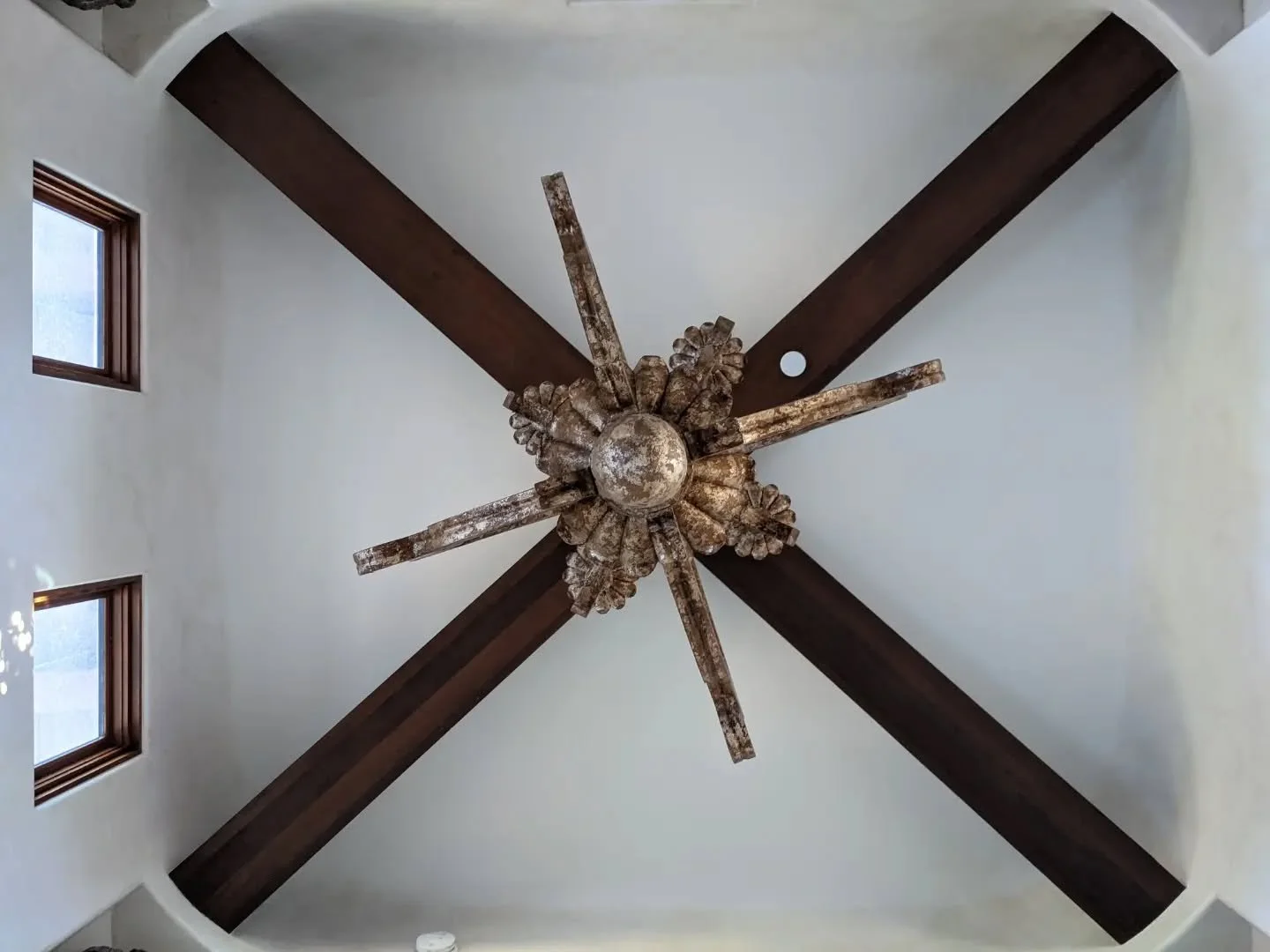 View fullsize Arched box beams on an 18 foot tall entry ceiling. Covered in 1/4" alder plywood so we could make the arch + get the right stain color.
